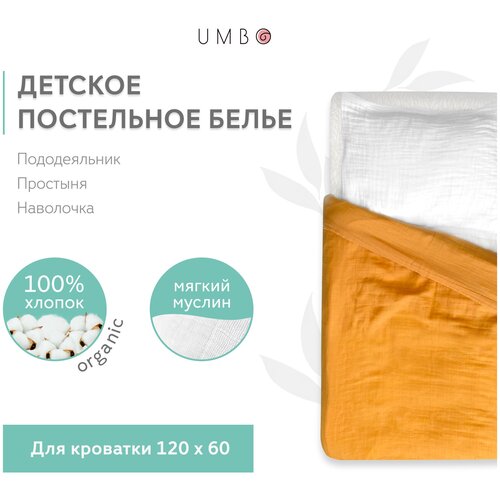 Комплект постельного белья из муслина UMBO из 3х изделий, 100% органический хлопок, с простыней на резинке для матраса 60х120 см