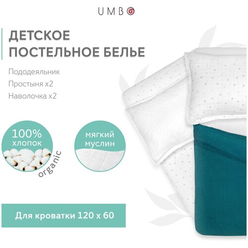 Комплект постельного белья из муслина UMBO из 5ти изделий, 100% органический хлопок, с простыней на резинке для матраса 60х120 см