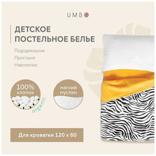 Комплект постельного белья из муслина UMBO из 3х изделий, 70% бамбук 30% органический хлопок, с простыней на резинке для матраса 60х120 см