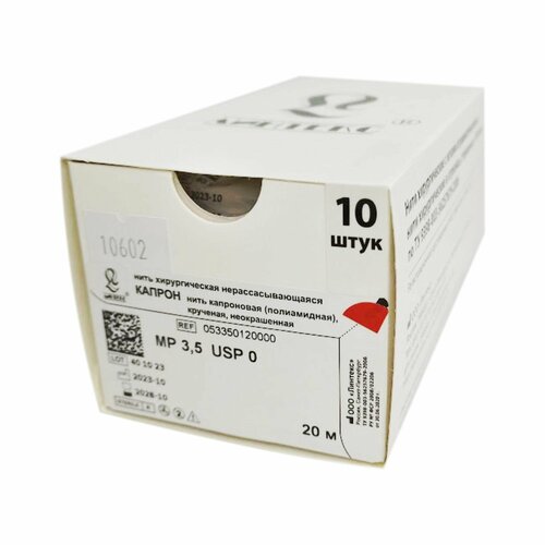 Шовный материал капрон - нить капроновая (полиамидная) крученая, неокрашенная, USP 0, катушка 20 метров (уп. 10 шт.)
