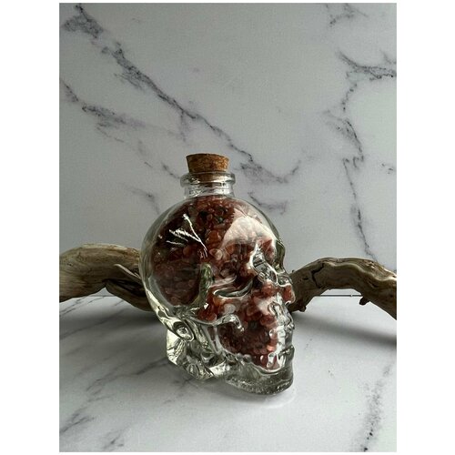 Стеклянная бутылка "Череп" с галтованным Сердоликом, 100х70х50 мм.