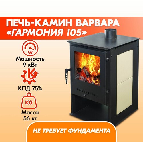 Печь камин дровяная отопительная Варвара " гармония 105 (плитка)" для дома и дачи, 9 кВт, 100 куб. м