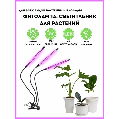 Фитолампа для растений рассады микрозелень с таймером светодиодная лампа на прищепке