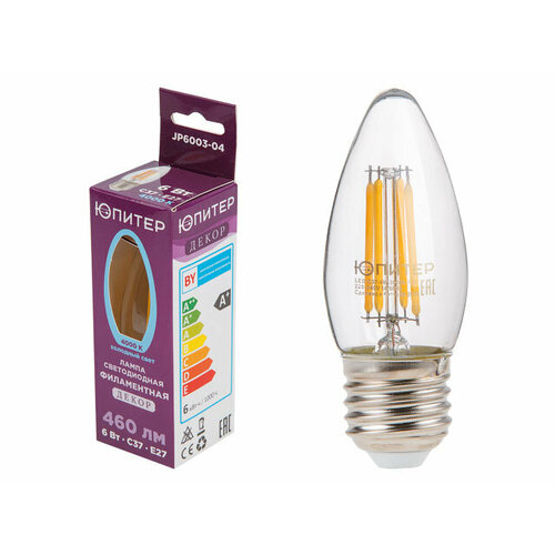 Лампа светодиодная филаментная C37 свеча 6 Вт E27 4000К юпитер декор (60 Вт аналог лампы накал, 560Лм) (JP6003-04)