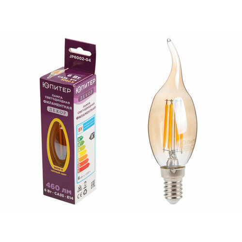 Лампа светодиодная филаментная C37 свеча 6 Вт E14 4000К юпитер декор (60 Вт аналог лампы накал, 560Лм) (JP6002-05)