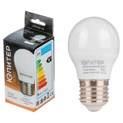 Лампа светодиодная G45 ШАР 7,5 Вт 170-240В E27 4000К юпитер люкс (JP5145-43)