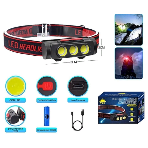 Фонарь налобный аккумуляторный/три ярких СОВ диода/белый+красный свет/легкосменяемый аккумулятор