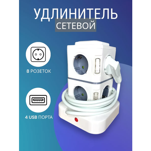 Сетевой фильтр удлинитель на 8 розеток, 4 USB