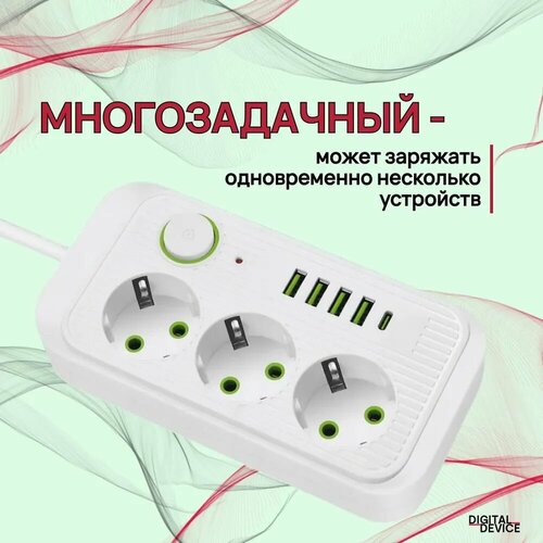 Удлинитель сетевой фильтр 2 метра 3 розетки + 4 USB + 1 Type-C
