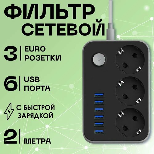 Удлинитель сетевой фильтр 2 метра 3 розетки 6 USB