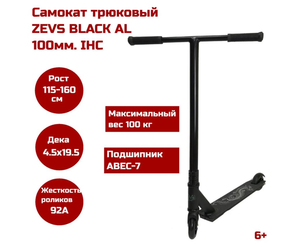 Трюковый самокат ZEVS BLACK AL 100мм, IHC 600013544787