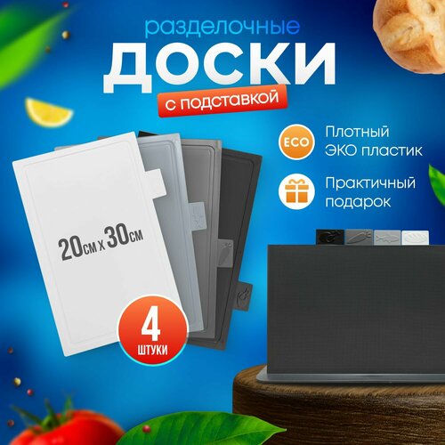 Набор разделочных досок, разделочные доски для кухни, пластиковые, на подставке, 30х20 см, 4 штуки