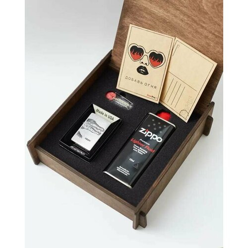 Подарочный набор оригинальная зажигалка Zippo 200 ALLIGATOR с топливом 125 мл + кремнии в деревянной коробке