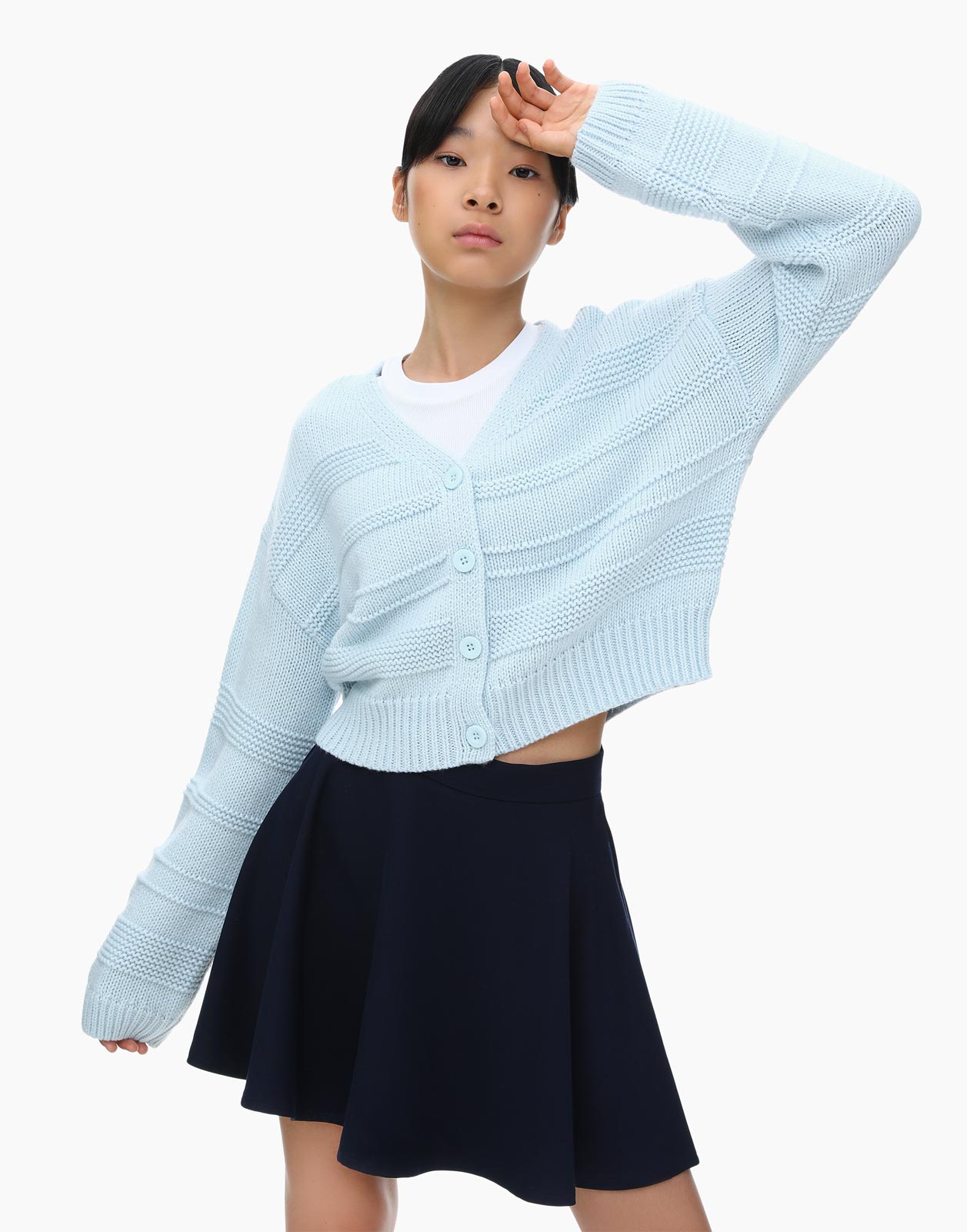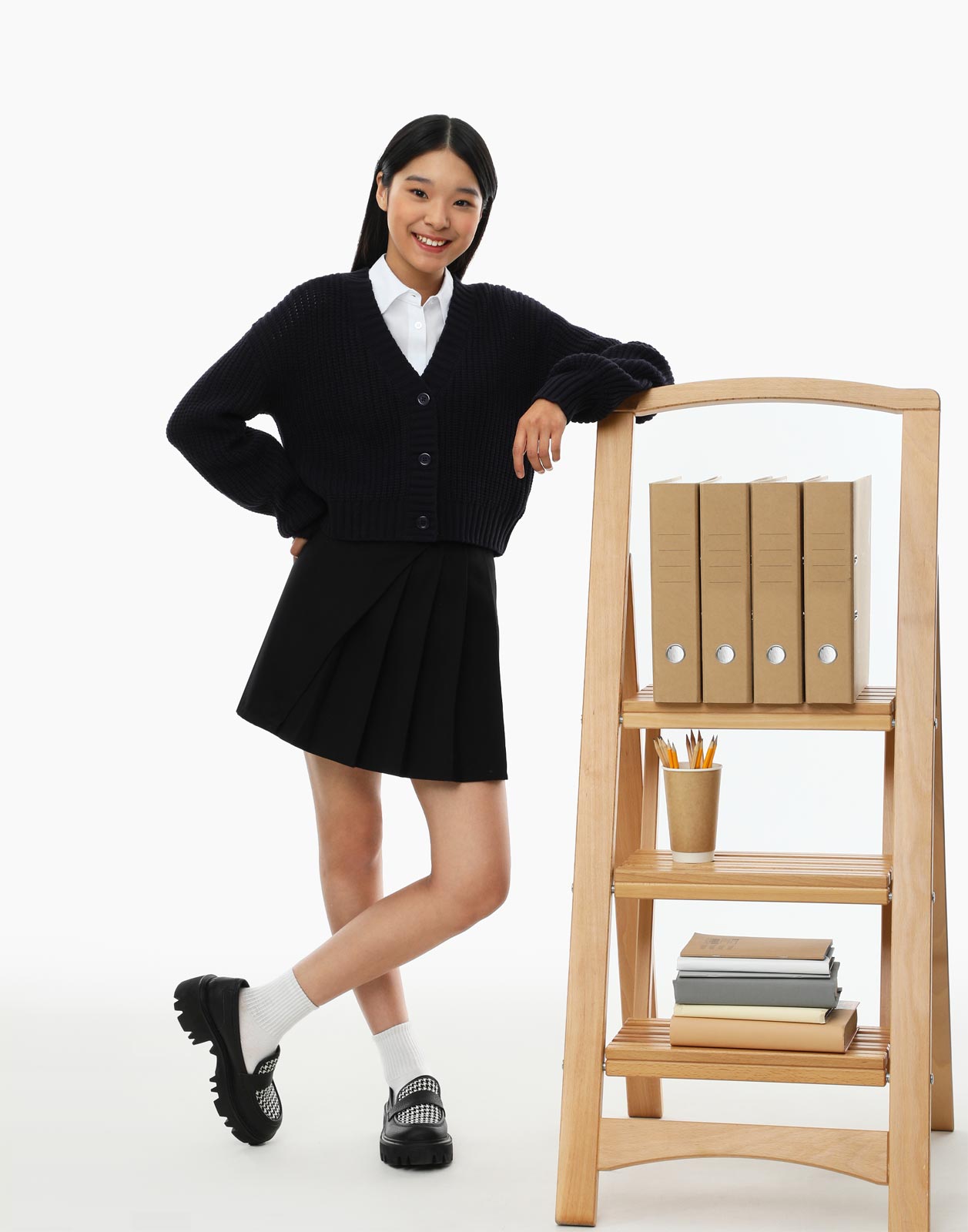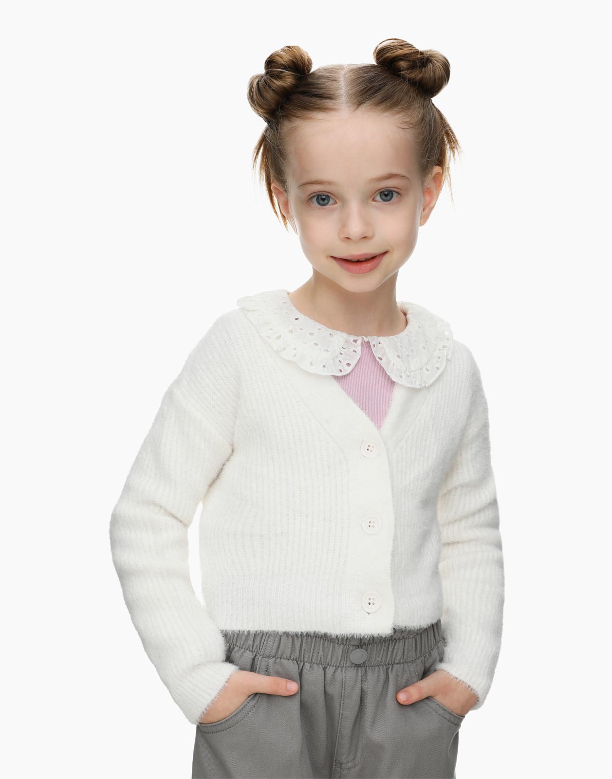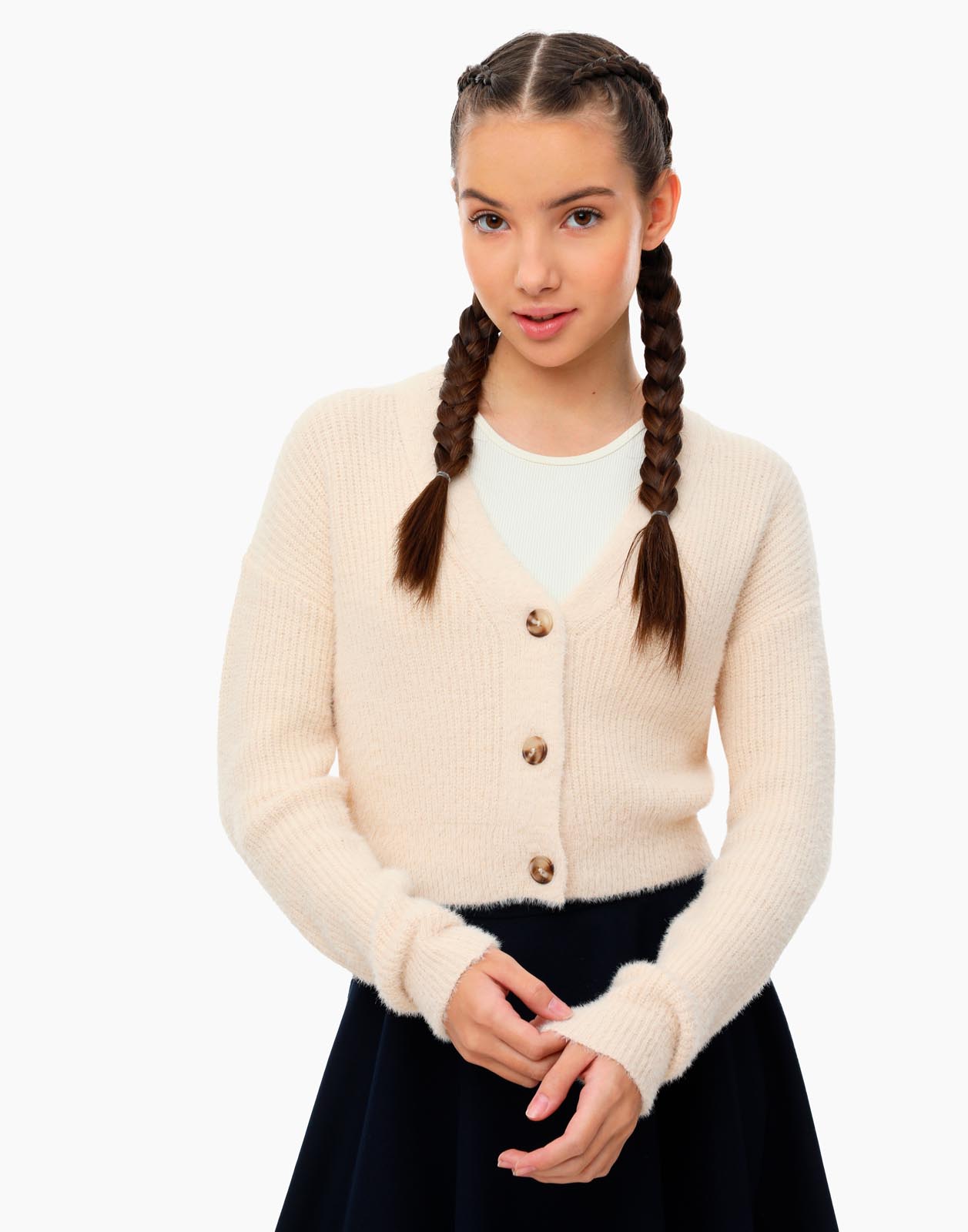 полиэстерУкороченный кардиган из новой детской коллекции станет стильным и тёплым завершением образа. Модель отлично впишется в луки в разных стилях: повседневный с джинсами, женственный с юбкой, классический с костюмными брюками. Кардиган также станет идеальным завершением школьного образа.