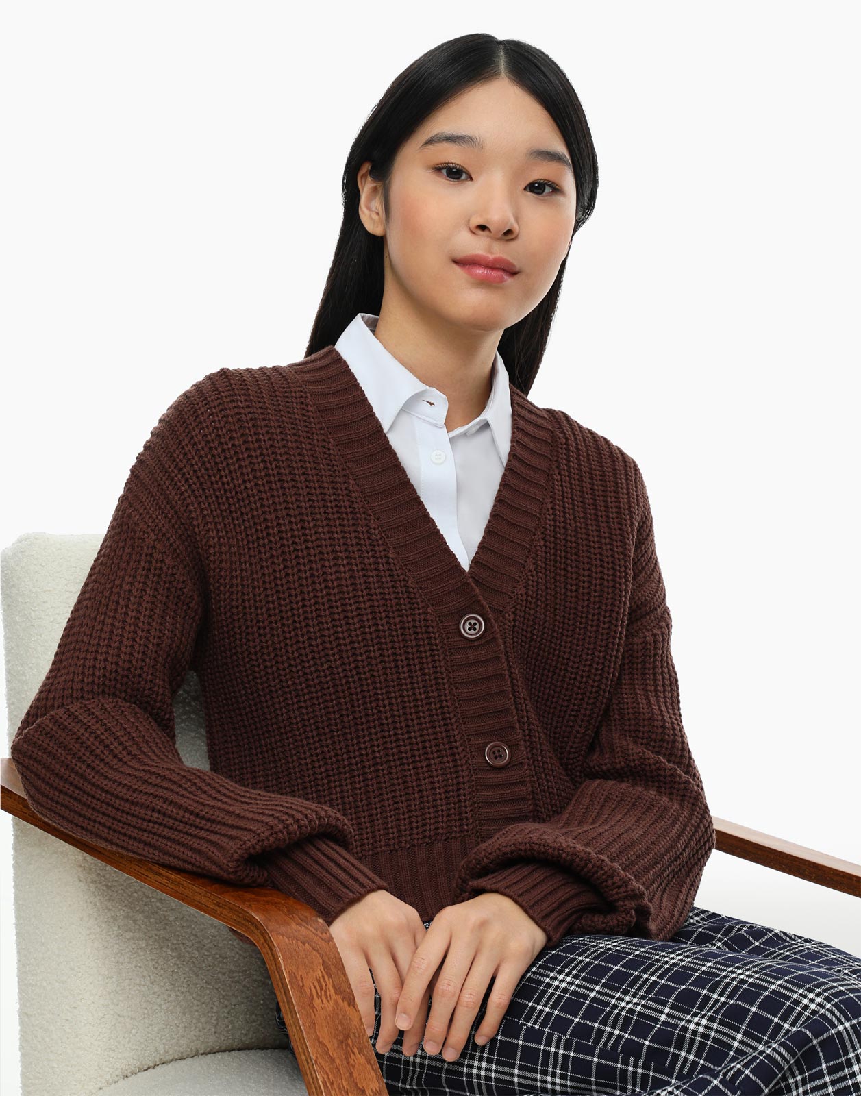 Коричневый укороченный кардиган с объёмными рукавами для девочки GSW005888