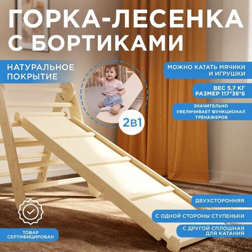 Представляем вашему вниманию одну из самых длинных деревянных горок на маркетплейсе. Горка-скалодром - это любимое развлечение малышей, которое вызывает не только радость и улыбку, но и формирует такие полезные качества как: сила воли, упорство, выносливость и самостоятельность. Ведь прежде чем скатиться, нужно забраться на вершину. Детская горка - двухсторонняя, что увеличивает варианты её использования. Одна сторона имеет гладкую, идеально отшлифованную поверхность, по которой кроха скатывается вниз или катает машинки, мячики и другие игрушки. На обратной стороне установлены рейки-ступеньки (горка и лесенка) /геометрические фигурки (горка и скалодром), по которым малышу удобно подниматься. Обе поверхности имеют сцепления, которые позволяют домашней горке крепиться к остальным тренажёрам Пиклер, детским спортивным комплексам или шведской стенке. Деревянная горка выполнена из высококачественной березовой фанеры высшего сорта. Покрыта бесцветным лаком/белой эмалью на водной основе, которые образуют эластичное