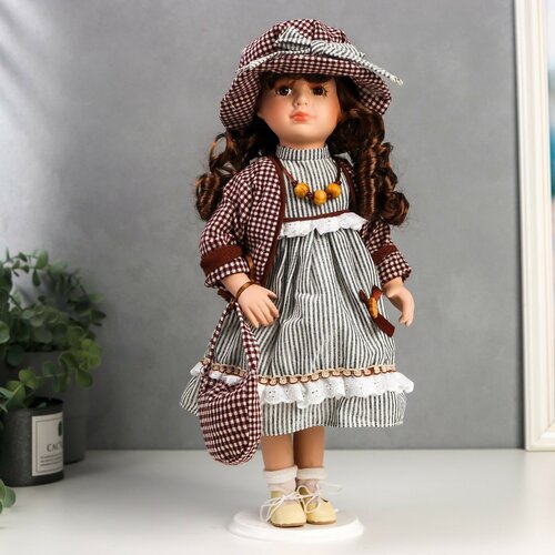 Кукла коллекционная керамика "Марина в бордовом платье в клетку" 40 см
