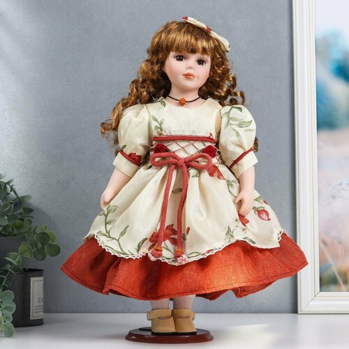 Кукла коллекционная керамика "Оля в платье с цветами и бордовой нижней юбкой" 40 см