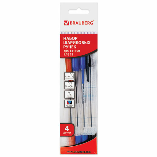 Упаковка 24 шт. Ручки шариковые BRAUBERG, набор 4 шт, ассорти, "Line", узел 1 мм, линия письма 0,5 мм, 141100