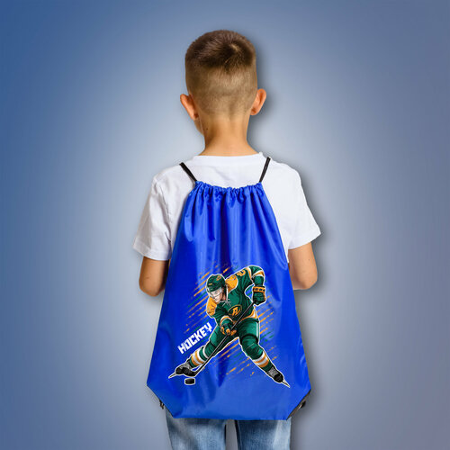 Сумка мешок для обуви с изображением хоккеиста с шайбой и надписью Hockey, синего цвета