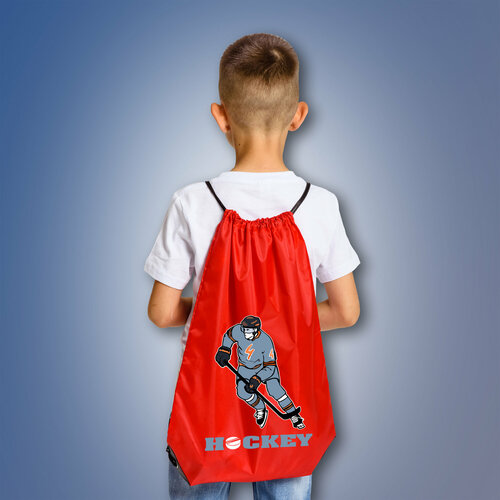 Сумка мешок для обуви с изображением хоккеиста с шайбой и надписью Hockey, красного цвета