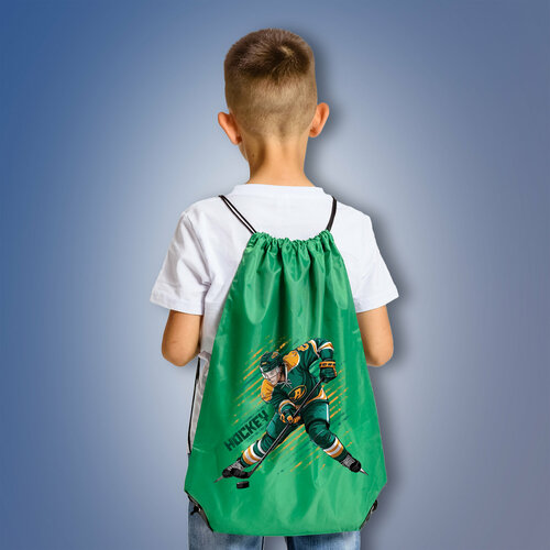 Сумка мешок для обуви с изображением хоккеиста с шайбой и надписью Hockey, зеленого цвета