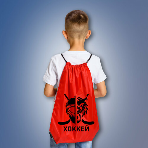 Сумка мешок для обуви с изображением хоккейной маски вратаря и надписью "Хоккей", красного цвета
