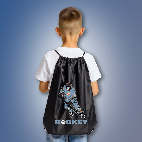 Сумка мешок для обуви с изображением хоккеиста с шайбой и надписью Hockey, черного цвета