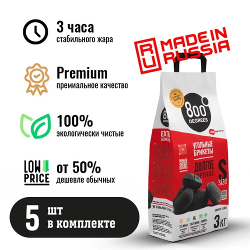 Уголь брикетированный 800 Degrees Долгое Горение, мешок 3 кг, 5 упаковок