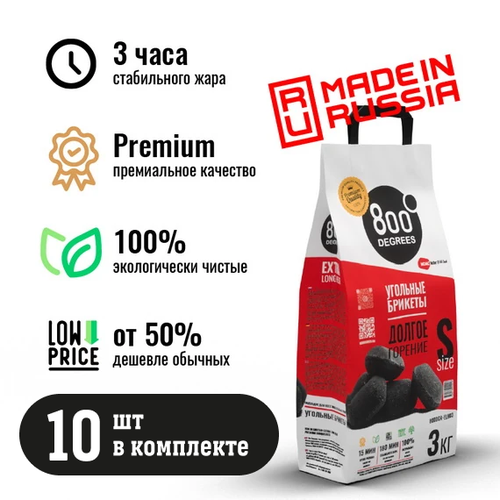 Уголь брикетированный 800 Degrees Долгое Горение, мешок 3 кг, 10 упаковок