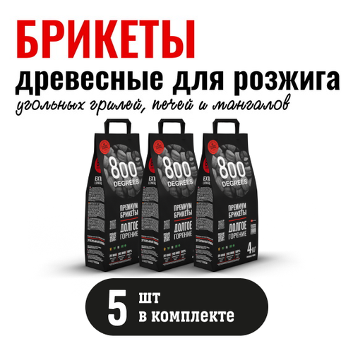 Уголь в брикетах 800 Degrees Premium Долгое Горение, мешок 4 кг, 5 упаковок