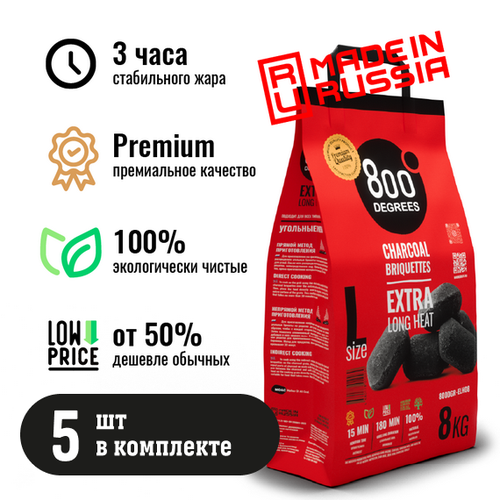Уголь брикетированный 800 Degrees Долгое Горение, мешок 8 кг, 5 упаковок