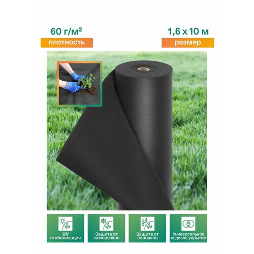 Геотекстиль садовый, 80 микрон, 1,6х10 м, чёрный, от сорняков, для грядок, для дорожек и ландшафтных работ
