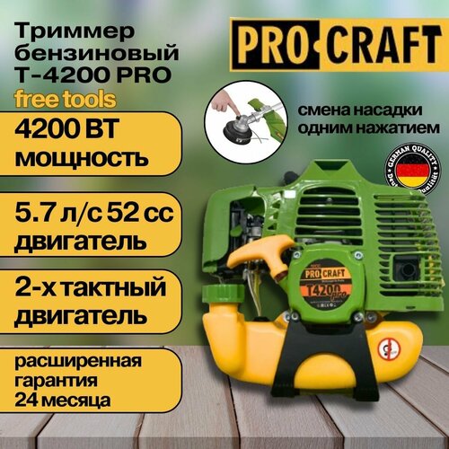 Триммер бензиновый садовый для травы Procraft, бензокоса T4200 PRO FREE TOOLS ( 52сс (2х тактный двигатель), 4200 Вт, 5.7 л. с