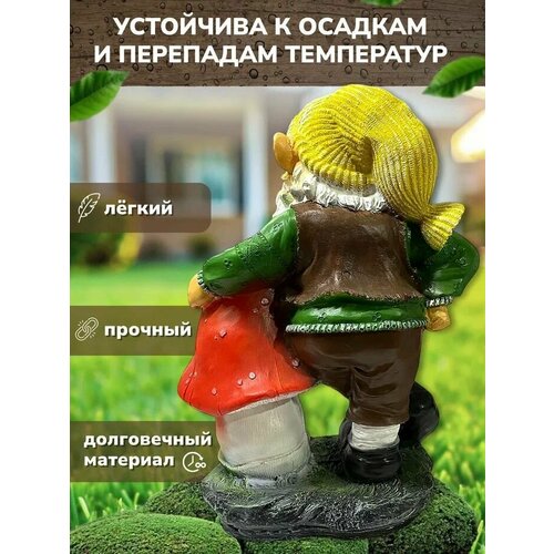 Большая садовая фигурка "Гном ушастый с двумя грибами" декор для дачи, сада и огорода