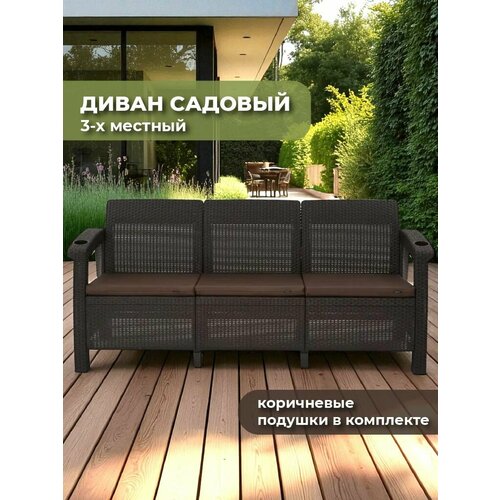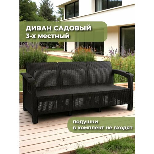 Цвет: мокко; Размер: 188 x 70 x 79 см; В комплекте 3 подушки, изготовленные из прочного и водоотталкивающего материала Оксфорд. Материал дивана: пластик; Количество посадочных мест: 3; Допустимая нагрузка на посадочное место: 106 кг; Вес: 15,75 кг. Трехместный садовый диван отлично впишется в интерьер загородного участка. Он целиком изготовлен из прочного полипропилена, поэтому имеет высокую механическую прочность и долговечность. Изделие не ржавеет, устойчиво к повышенным температурам и выгоранию: его можно оставлять на участке и в дождь, и на ярком солнце. Диван легко перемещать с места на место, чтобы создать зону отдыха там, где захочется. Подушки для дивана черного цвета входят в комплект, изготовлены из прочного и водоотталкивающего материала Оксфорд 600. Также при желании можно с легкостью собрать сет на свой вкус, дополнив его одной или несколькими единицами мебели линейки. Диван - это идеальное решение по оформлению зоны отдыха в доме, на садовом участке, в офисном помещении или в кафе.