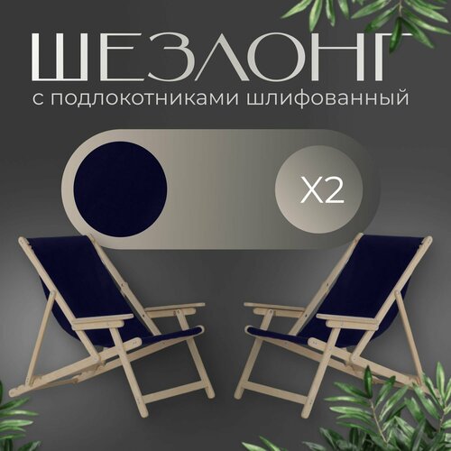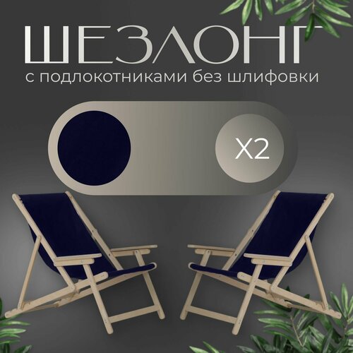 Кресло-шезлонг с подлокотниками для дома, для дачи, складной с темно-синей тканью без шлифовки, комплект 2 шт
