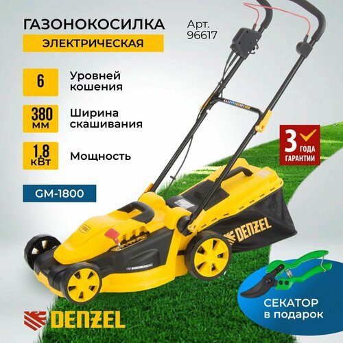 Газонокосилка электрическая от сети для дачи DENZEL GM-1800, 1800 Вт, ширина 38 см, 6 уровней, 40 л, 96617 / Триммер для дачи / В подарок мужчине