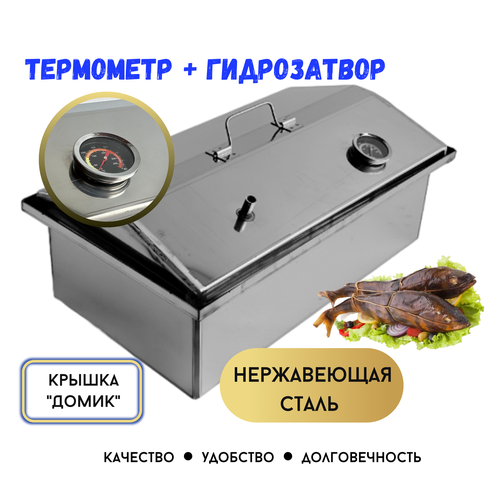 Коптильня горячего копчения с гидрозатвором домашняя, нержавеющая сталь с термометром ( для копчения рыбы, мяса, сала и овощей)
