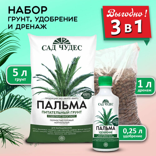 Сад Чудес Набор для комнатных растений - Грунт для Пальм 5 л, удобрение органическое 250 мл, дренаж керамзитовый 1 л