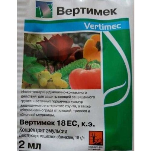 Вертимек – биологический инсектицид кишечно-контактного действия для защиты овощных, цветочных горшечных культур защищенного и открытого грунта, а также яблони, и винограда от клещей, трипсов, и яблонной медяницы. Препарат оказывает минимальное воздействие на полезную энтомофауну. Уборка урожая может быть начата уже спустя 3 дня после последней обработки. После применения препарата вредители прекращают питаться в течение 2 часов, а их гибель наступает через 1-5 дней. Период защитного действия отличается значительной продолжительностью до 3 недель.