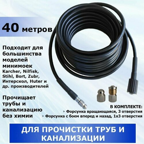 Шланг для прочистки канализации и труб, две форсунки в комплекте, 40 метров. Подходит для минимойки Karcher, Stihl, Huter и др. производителей
