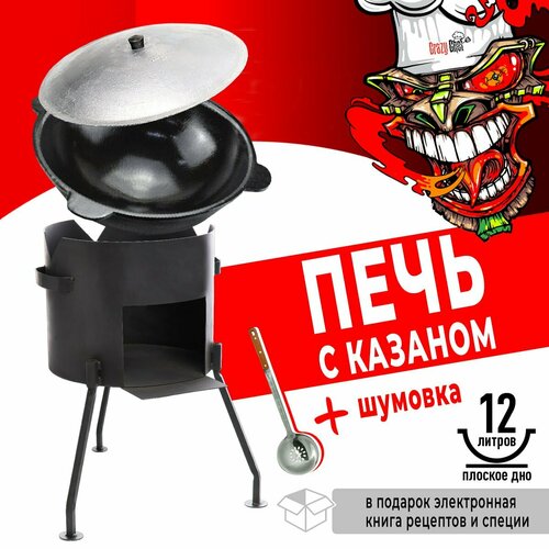 Казан чугунный с плоским дном, 12 л, с крышкой + печь со съемными ножками
