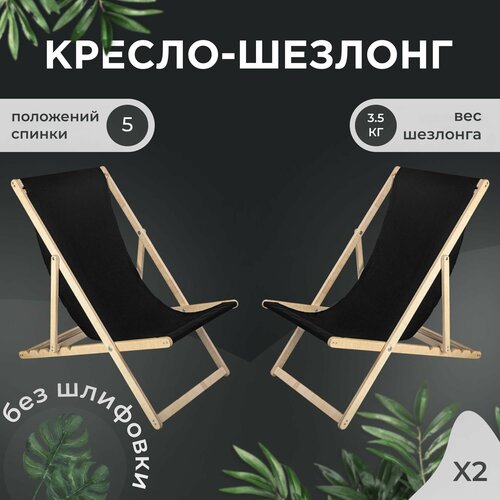 Кресло-шезлонг "Березка" без шлифовки с черной тканью складной для дома и дачи, комплект 2 шт