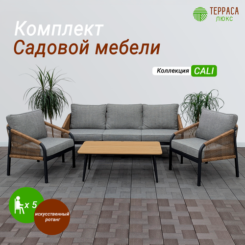 Комплект садовой мебели CALI, искусственный ротанг, 5 персон, 2 кресла, 3-х местный диван, кофейный столик, серо- бежевый
