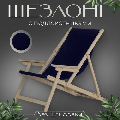 Кресло-шезлонг с подлокотниками для дома, для дачи, на пляж и пикник складной с темно-синей тканью без шлифовки
