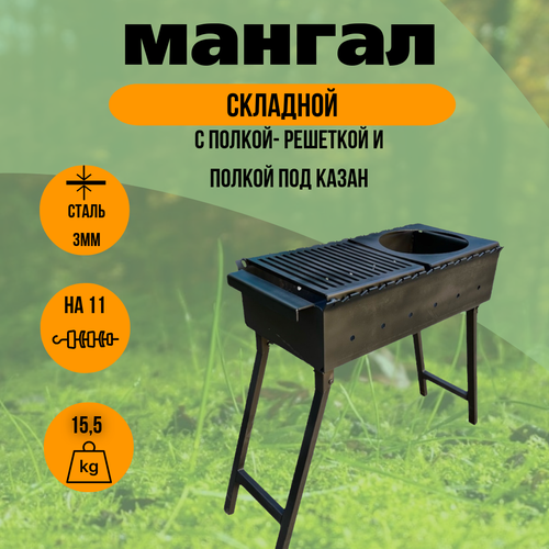 Мангал складной 600 мм с полкой-решеткой и полкой под казан, сталь 3 мм