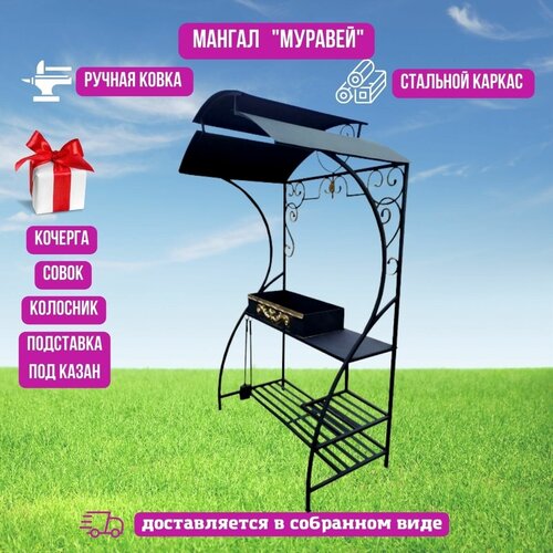 Мангал "Муравей" с крышей и жаровней для дачи с подставкой под казан, кованый уличный навес для отдыха на природе из стали 3 мм, стационарный, высокий, каркасный