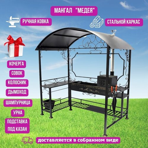 Универсальный кованый мангал-беседка с крышей и печкой "Медея" для дома и дачи