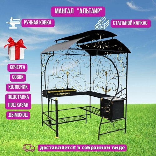 Мангал беседка "Альтаир" с крышей для дачи и отдыха на природе, кованый уличный навес из стали 3 мм, с жаровней для шашлыка, печью под казан с дымоходом, стационарный, высокий, мангальная зона